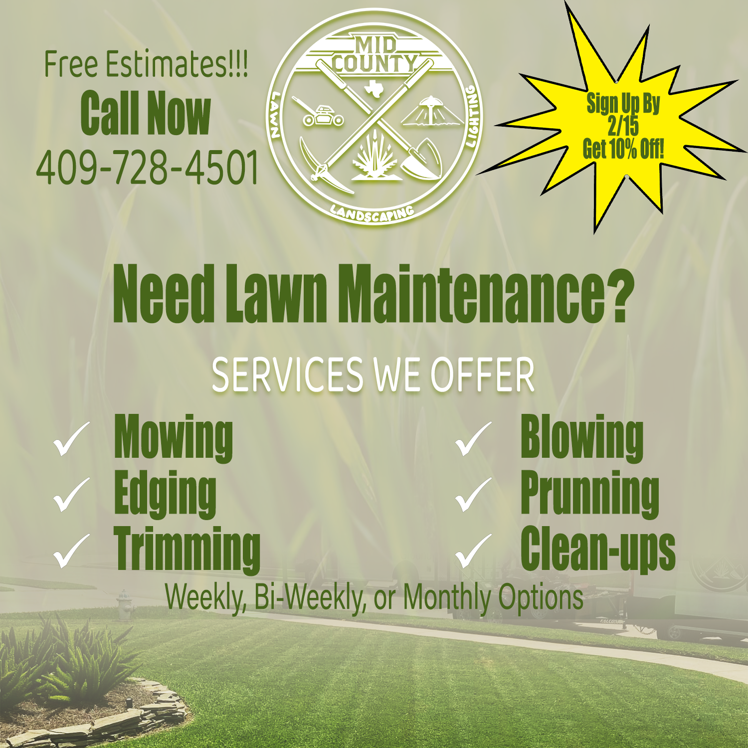 A healthy, well‑maintained lawn makes a strong first impression. Mid‑County Lawn, Landscape & Lighting provides dependable lawn care services for residential and commercial properties across Mid‑County and Southeast Texas. We focus on consistency, clean results, and reliable scheduling you can count on.